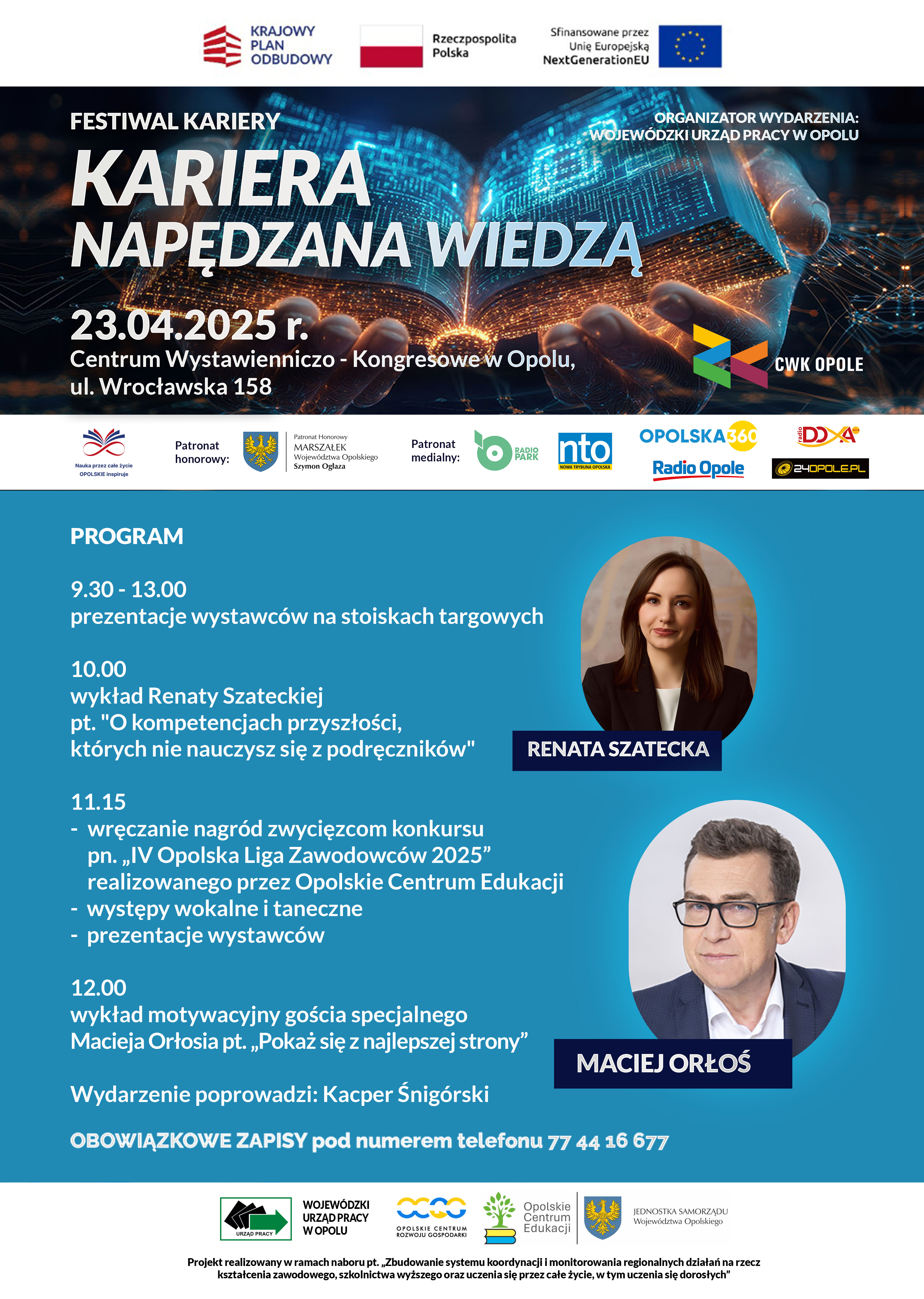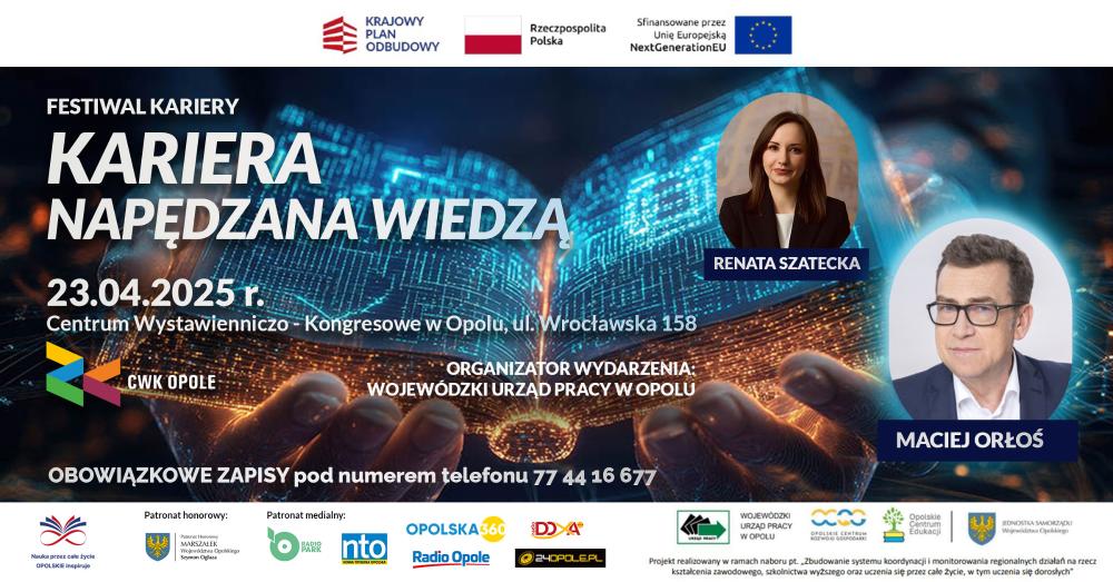 Wojewódzki Urząd Pracy w Opolu organizuje kolejną edycję Festiwalu Kariery, który odbędzie się 23 kwietnia 2025 roku w Centrum Wystawienniczo – Kongresowym w Opolu (przy ul. Wrocławskiej 158).