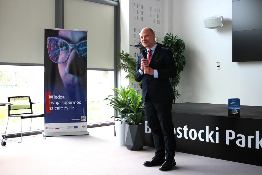 Dyrektor Wojewódzkiego Urzędu Pracy w Białymstoku Hubert Ostapowicz wita gości seminarium